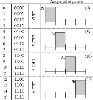 Brief description of SPPM: Assume a spectral efficiency of M = 4 bits/symbol, a number of LEDs, N_LED = 4, and 4-PPM. For example, symbol "5" with binary representation "0101" is transmitted as follows: the first log2(N_LED) most significant bits (2 in this case) determine the LED that is transmitting while the remaining bits determine the pulse position. Therefore, symbol "5" is transmitted by LED 2 with a pulse in the second slot of the 4-PPM pulse pattern.